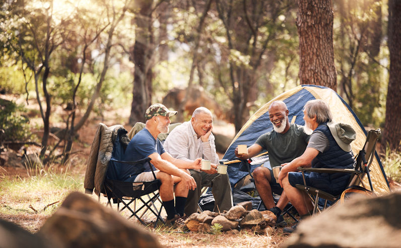 overnight camping experience, men gather around a campfire